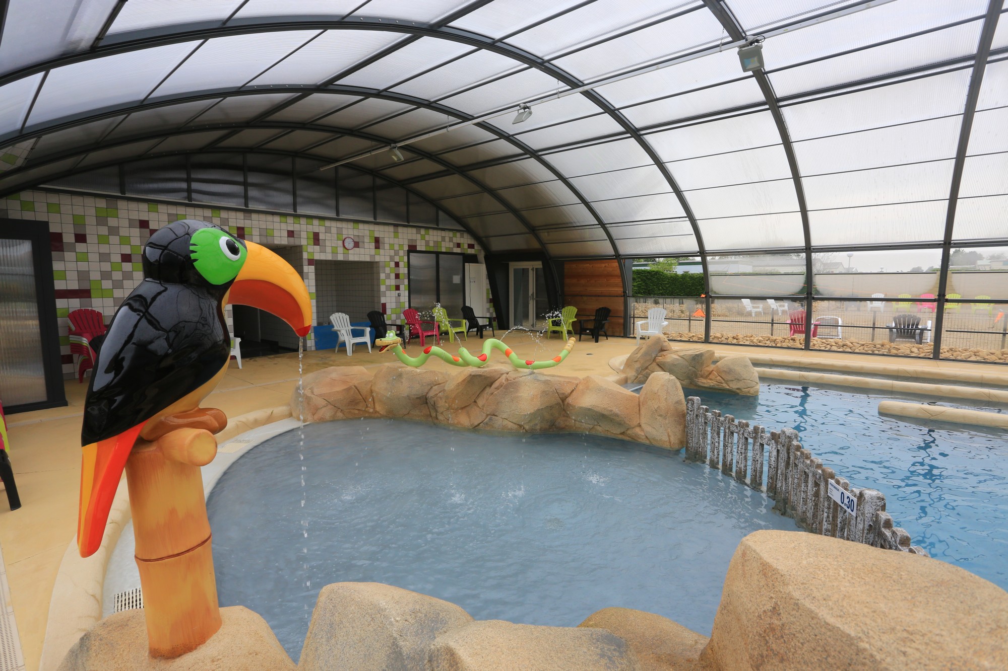 Une piscine couverte et chauffée de 20 mètres de long sur 10 mètres de large! Elle comprend une zone de natation, des banquettes anatomiques et un espace balnéo dans lesquels vous vous ferez masser, une pataugeoire pour les plus petits, une rivière à courant, le tout agrémenté de cascades, rochers, plantes, cols de cygne et geysers! L’abri s’ouvre sur l’extérieur pour vous permettre de profiter des transats et des plages extérieures. Détendez-vous, vous voilà sous les tropiques!