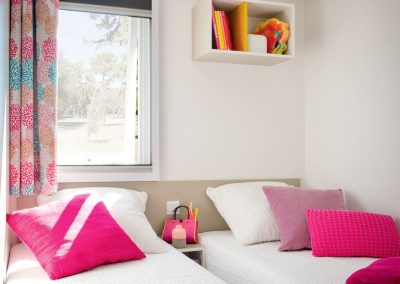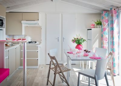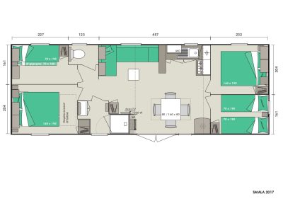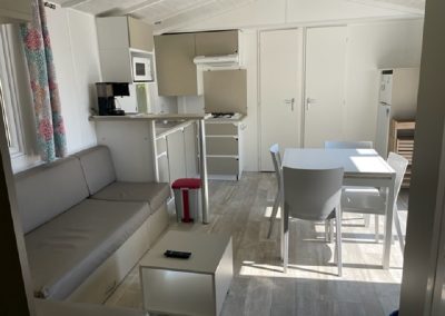 Mobil Home 4 chambres pouvant accueillir jusqu’à 9 personnes! Idéal pour les grandes familles! Voire à deux familles ou entre amis… Tout est soigneusement pensé dans ce grand modèle pour répondre à la tendance actuelle des vacances en petits groupes : chacun a sa chambre, une grande pièce de vie conviviale et spacieuse ; une cuisine bien équipée et fonctionnelle et une banquette XXL! Bienvenue dans le SMALA.